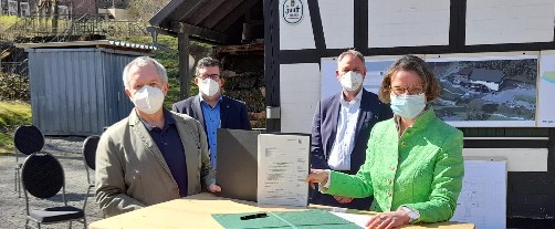 Frau Ministerin Ina Scharrenbach hat dem Dorfgemeinschafts- und Gartenbauverein am 31.3.2021 den Bescheid des Landes NRW über Fördergelder in Höhe von 433 042.69 €, in einer kleinen Runde, bei strahlendem Sonnenschein übergeben.